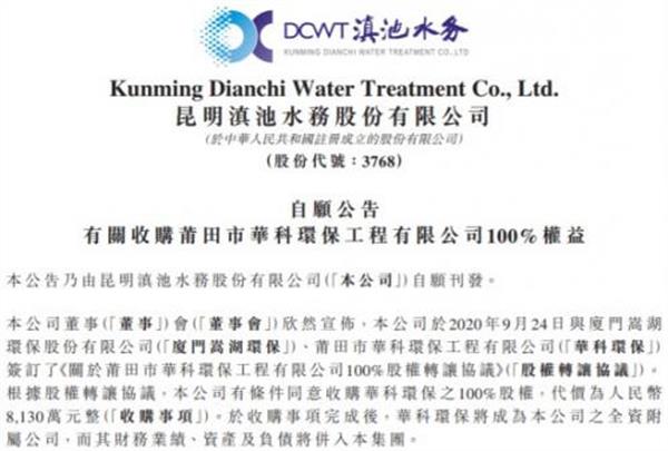 9月24日,滇池水務(wù)宣布,公司與廈門嵩湖環(huán)保股份有限公司、莆田市華科環(huán)保工程有限公司(以下簡稱華科環(huán)保)簽訂協(xié)議,收購華科環(huán)保100%股權(quán),代價為人民幣8130萬元,交易各方已簽訂股權(quán)轉(zhuǎn)讓協(xié)議。本文轉(zhuǎn)載于網(wǎng)絡(luò),如涉及版權(quán)問題請發(fā)現(xiàn)及時聯(lián)系,我們定會配合刪除;我公司專業(yè)生產(chǎn)一體化預(yù)制泵站,磁力泵,塑料泵,離心泵,排污泵,潛水泵,化工泵,油泵,隔膜泵等。