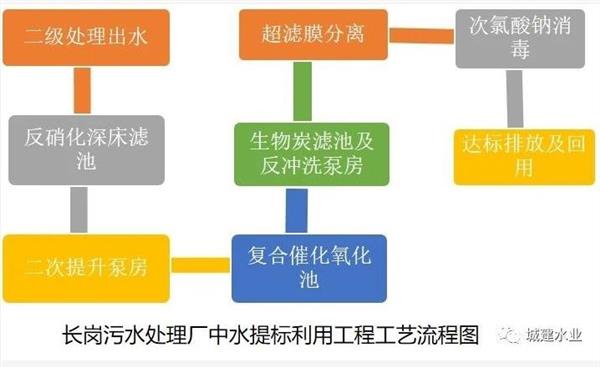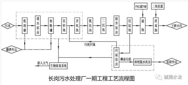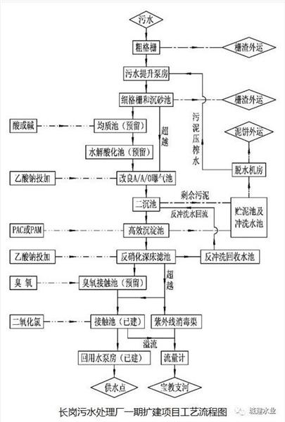 為達(dá)到環(huán)保部門要求的水質(zhì),長崗污水處理廠尾水進行了提標(biāo)改造,具體工藝如下: